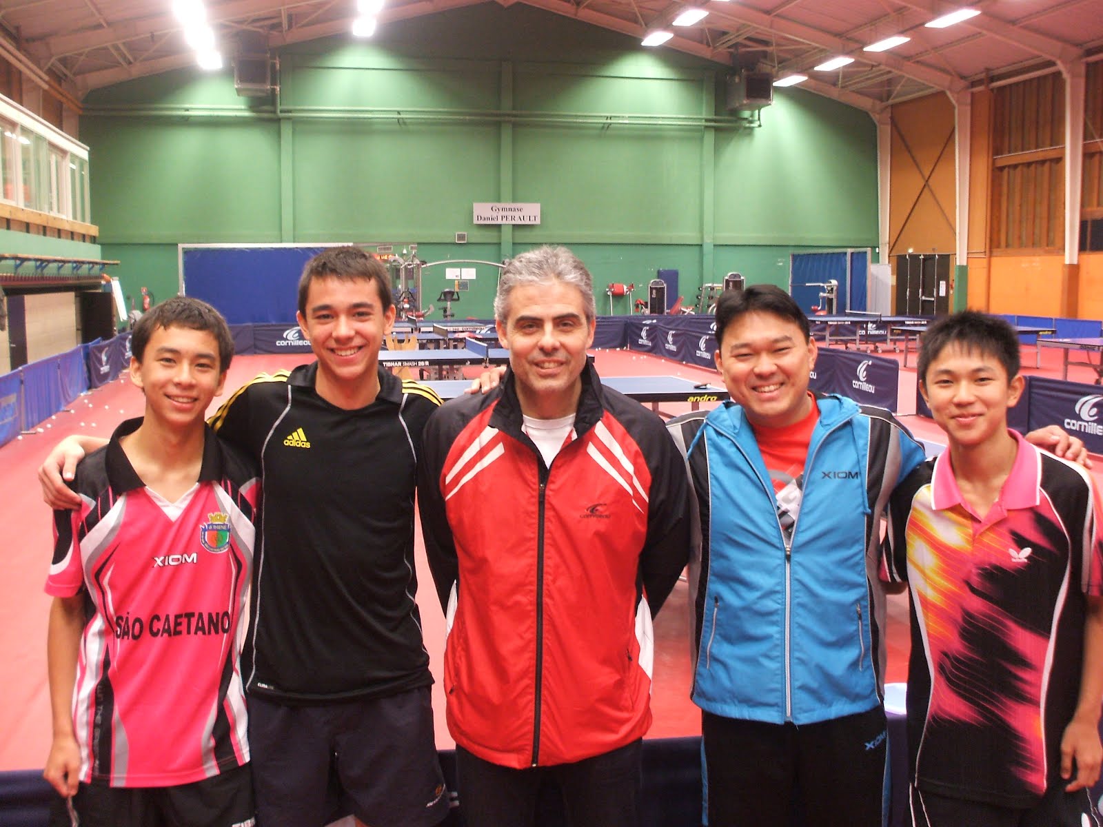 Os brasileiros Eric Jouti, Hugo Calderano e Vitor Ishiy receberam um visitante ilustre durante o treino dessa quinta-feira no Insep, o Centro de Treinamento da Seleção francesa, onde os três estão se preparando para a disputa de uma etapa do Circuito Mundial Juvenil, que acontecerá na República Tcheca entre os dias 15 e 19 desse mês.